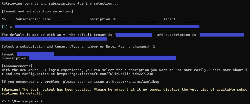 サブスクは1個しか持ってないので「1」しか出てこない。どの番号のサブスク&テナントを選ぶか聞いてくるので「1」を指定。