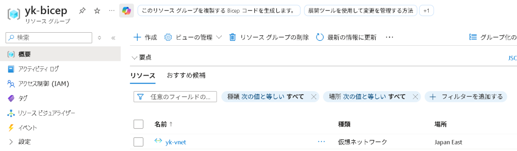 次にデプロイ先のリソースグループ「yk-bicep」を Azure ポータルで作っておき、main.bicep ファイルがあるフォルダに移動して下記でデプロイ。