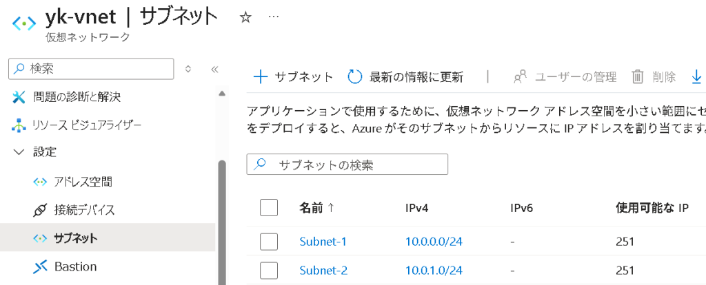name は仮想ネットワークの名前。’name’ はどうかと思うので ‘yk-vnet’ に変更。