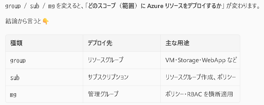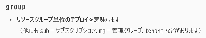 「group」ってリソースグループって意味だろうけど、次に create ってついているから一見「リソースグループを作るの?」って思ったけど、ここの部分は違う意味だった。
