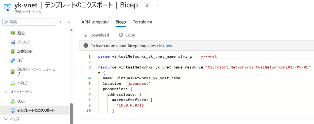 Azure ポータルの「テンプレートのエクスポート」から既存リソースの Bicep をエクスポートできる。