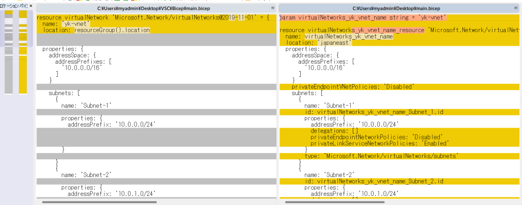 明らかにエクスポートした Bicep ファイルの方がボリュームが多い。