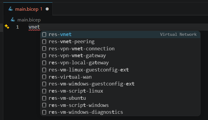 おっ、どうやら vnet と名の付くリソースの候補が出てくるようだ。